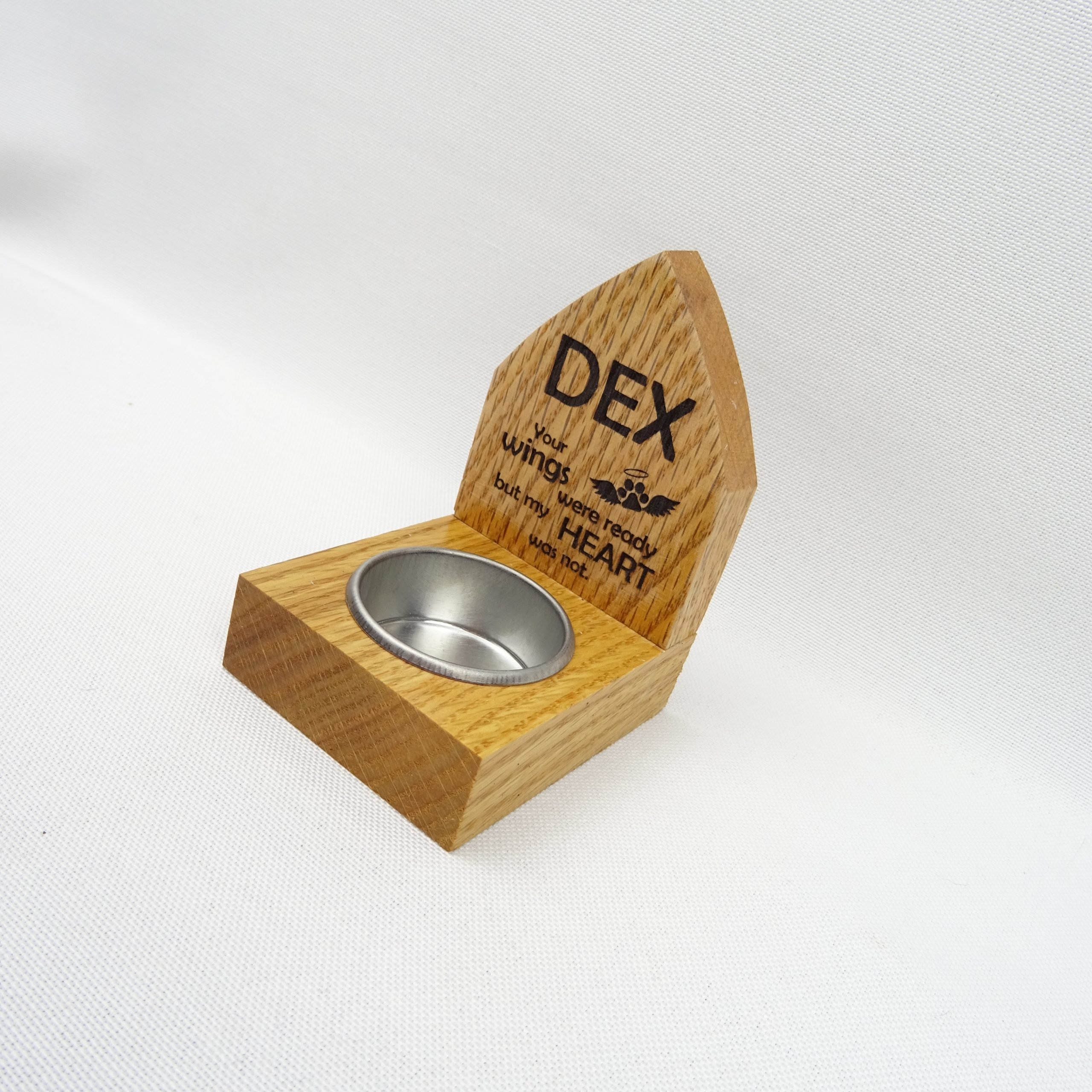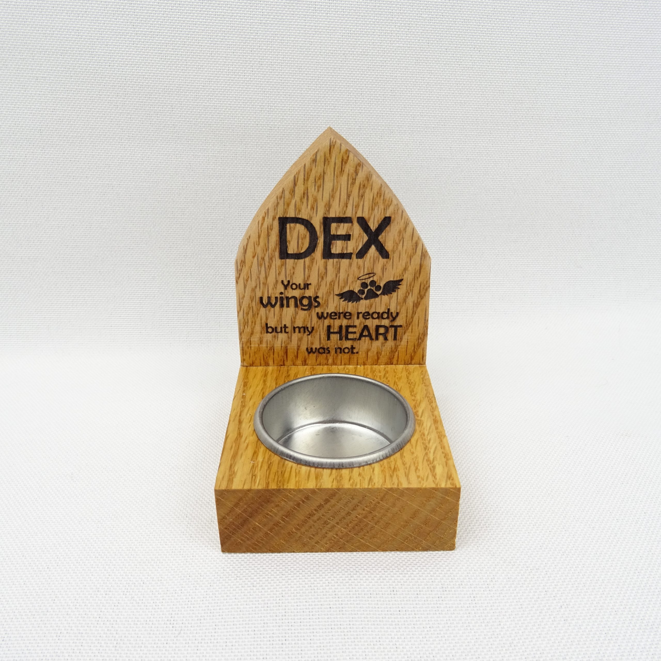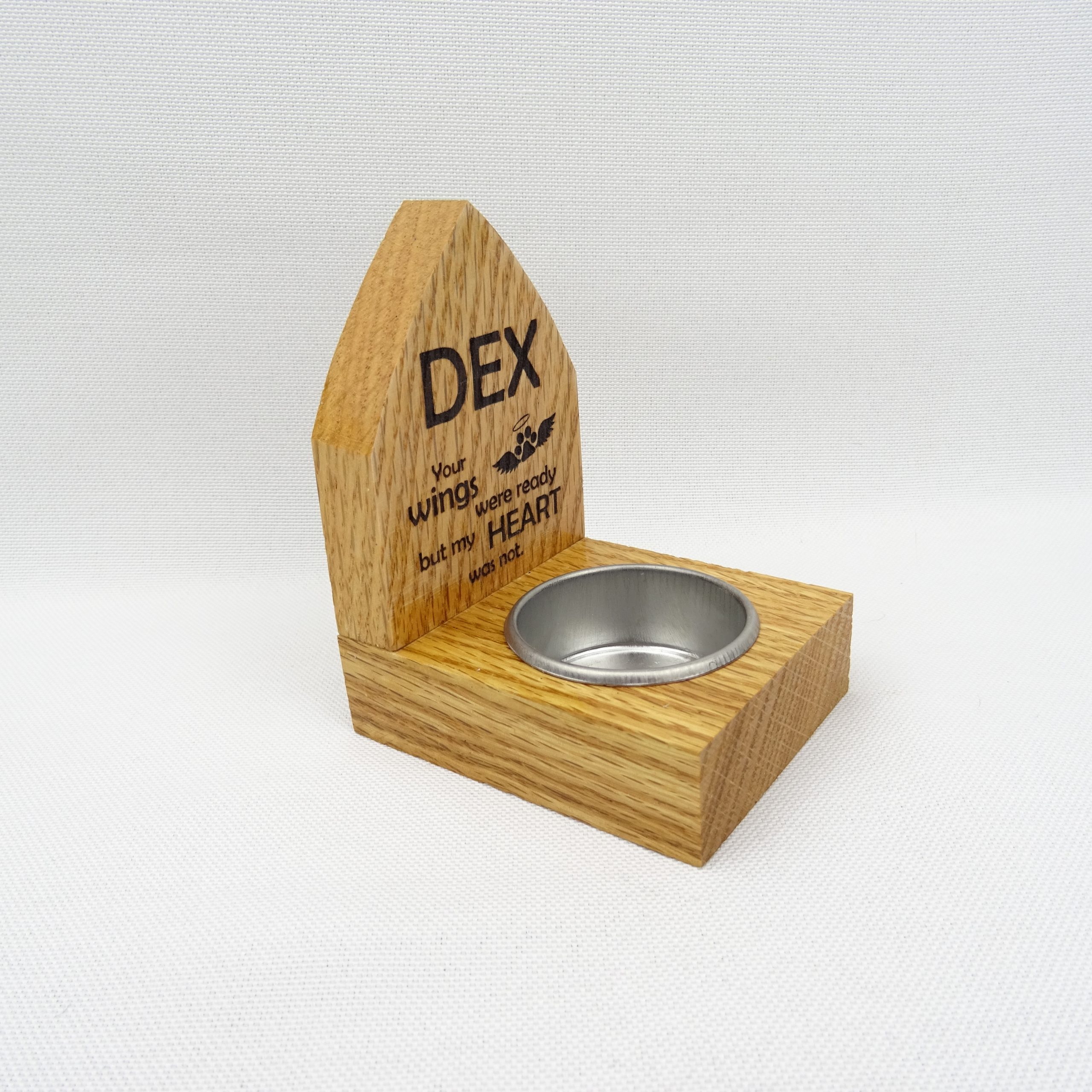 Honor the memory of a beloved pet or loved one with this beautifully crafted Backed Memorial Candle Holder. Handmade from solid white oak, each holder is carefully sanded, sealed, and finished with a durable high-gloss lacquer that highlights the natural grain of the wood.