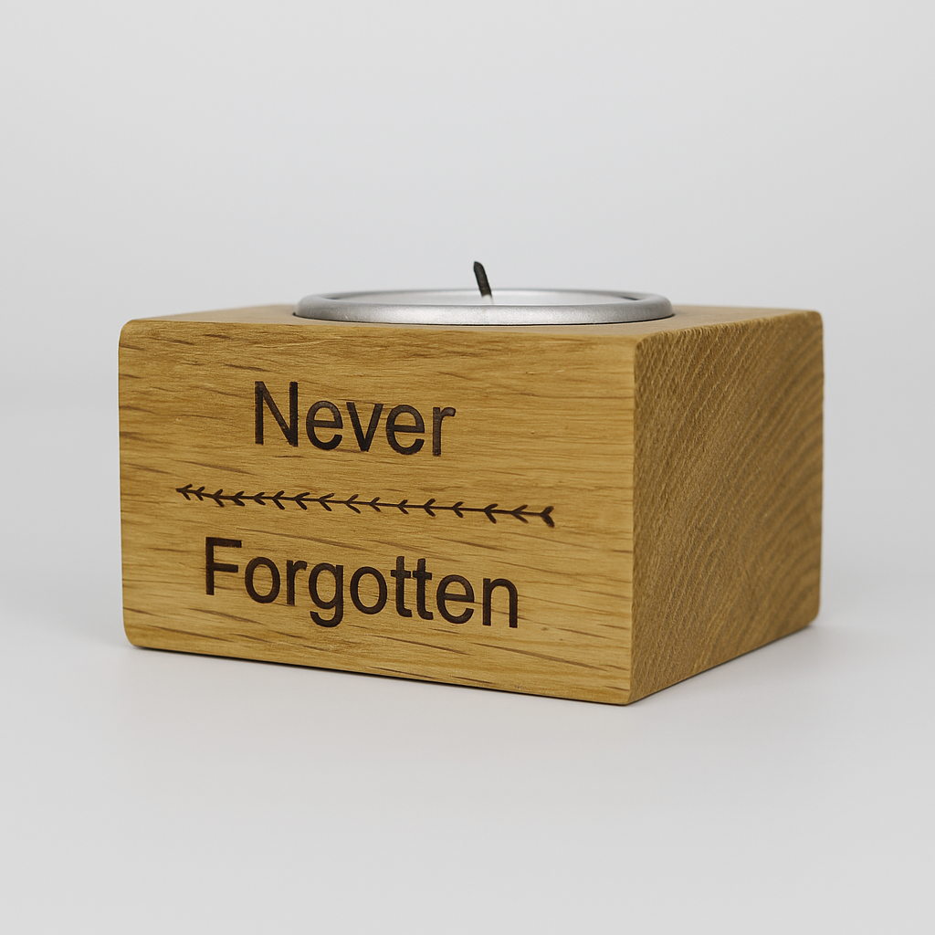 Made from solid white oak and featuring a metal insert for additional safety. Each candle holder is sealed and sanded back twice, then double finished in a lacquer, making it easy to wipe clean and look its best for several years to come. This candle holder will come ready made and engraved with text on each side. The reverse text will show “Never Forgotten” by default unless otherwise mentioned.