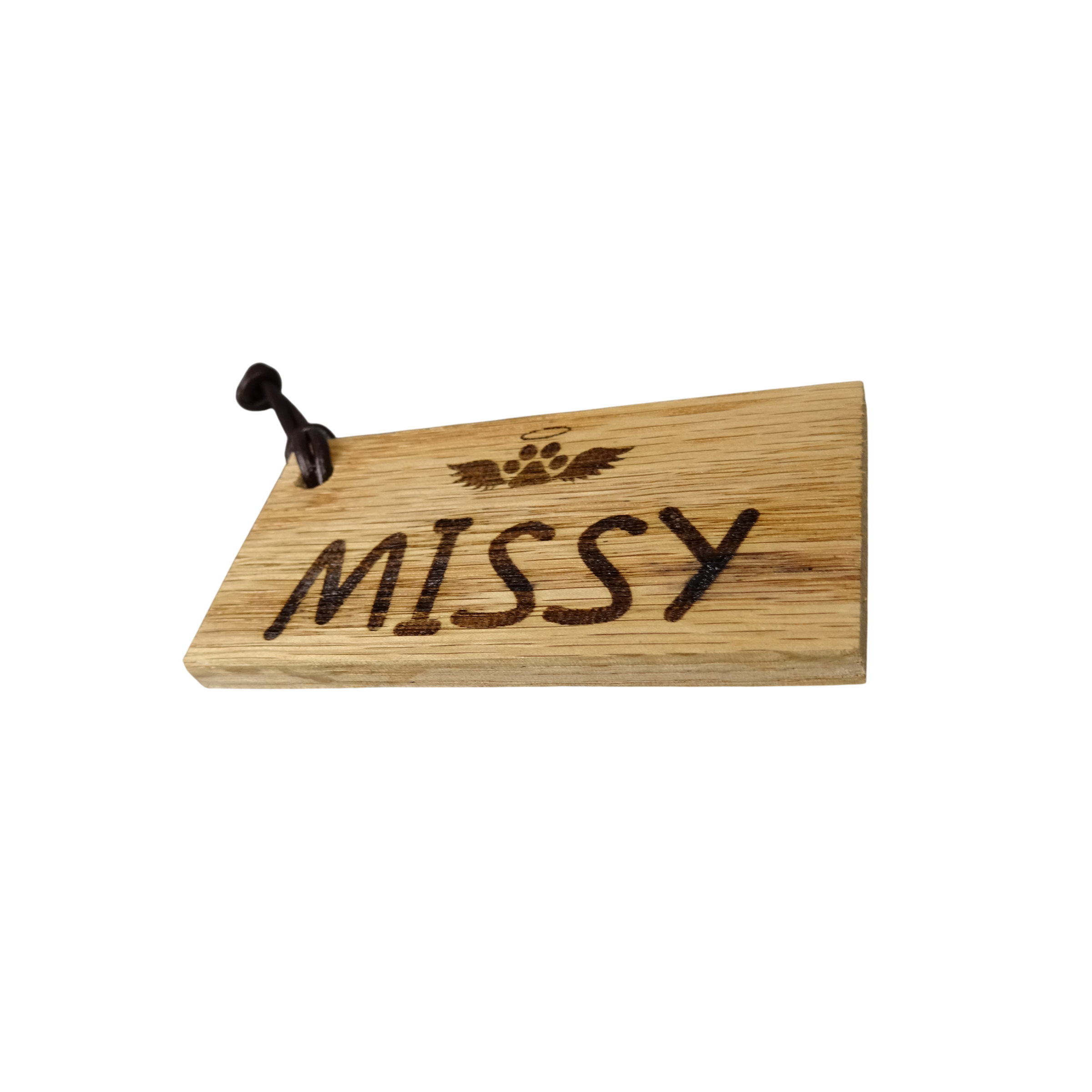 Each personalised Oak keyring comes with a leather rope piece for easy and secure attachment onto a set of keys. There is enough room on this style for a name on one side and a short saying on the other side. Alternatively, you can have a name on each side. There is no set design for these keyrings, just so long as the details fit!